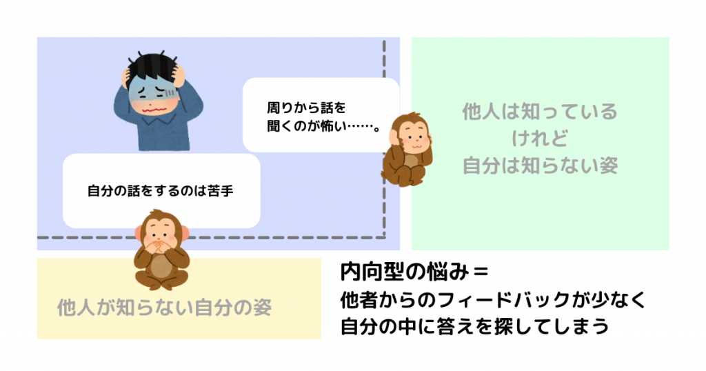 内向型の方は、「秘密の窓(自分は知っているが他人は気づいていない自己)」と、「盲点の窓(自分は気づいていないが、他人は知っている自己)」を共有する機会が少なく、自分の心のなかで悶々と考え続けてしまい、自分と他者の間にコミュニケーションのギャップを生み出しやすいといえます。